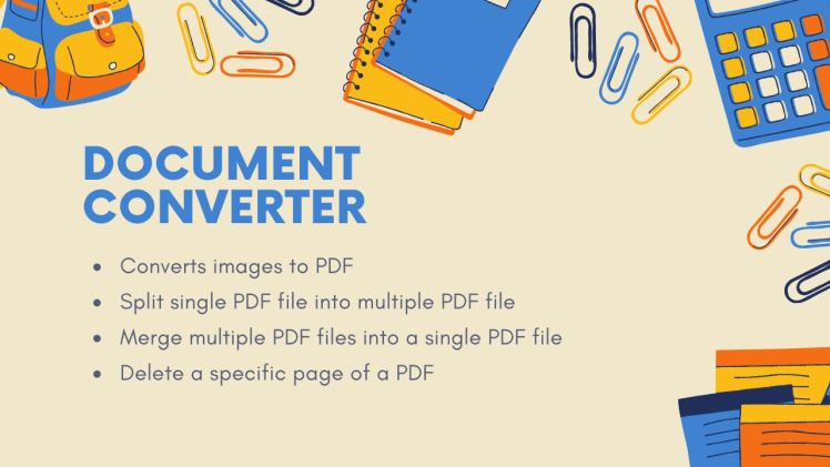 Document Converter App – Converts images to PDF (JPG to PDF or PNG to PDF), Split PDF file into multiple PDF files, Merge multiple PDF files into single PDF file.