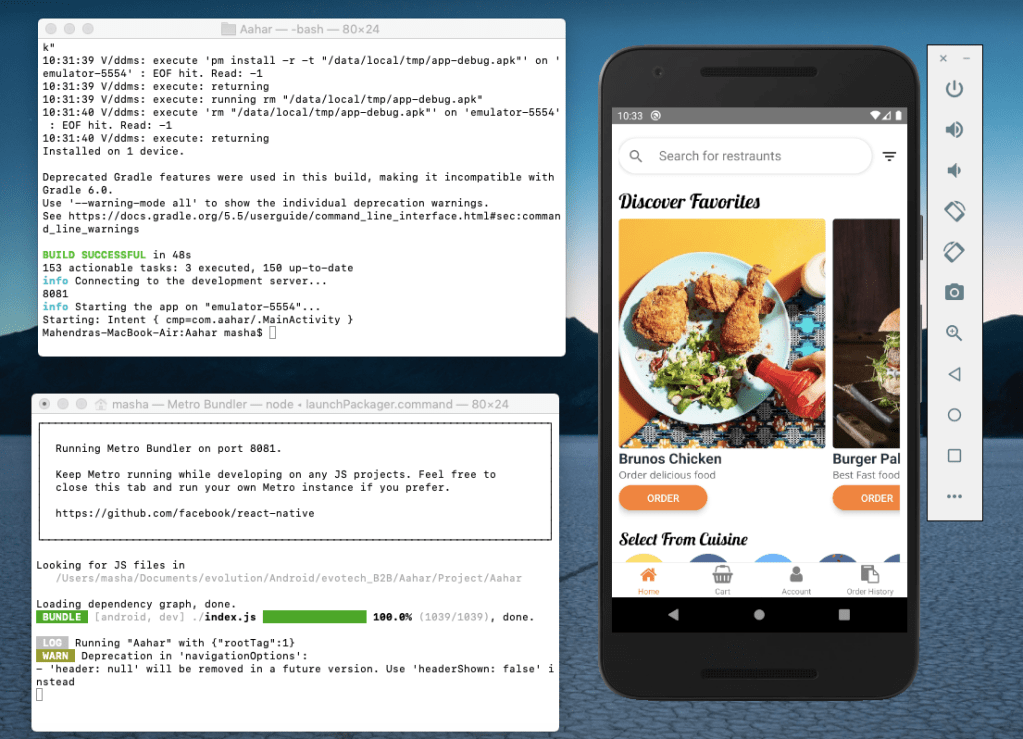 After installing all dependencies you are ready to run application in your simulator or on your device. To run execute this command in your terminal : “react-native run-android”